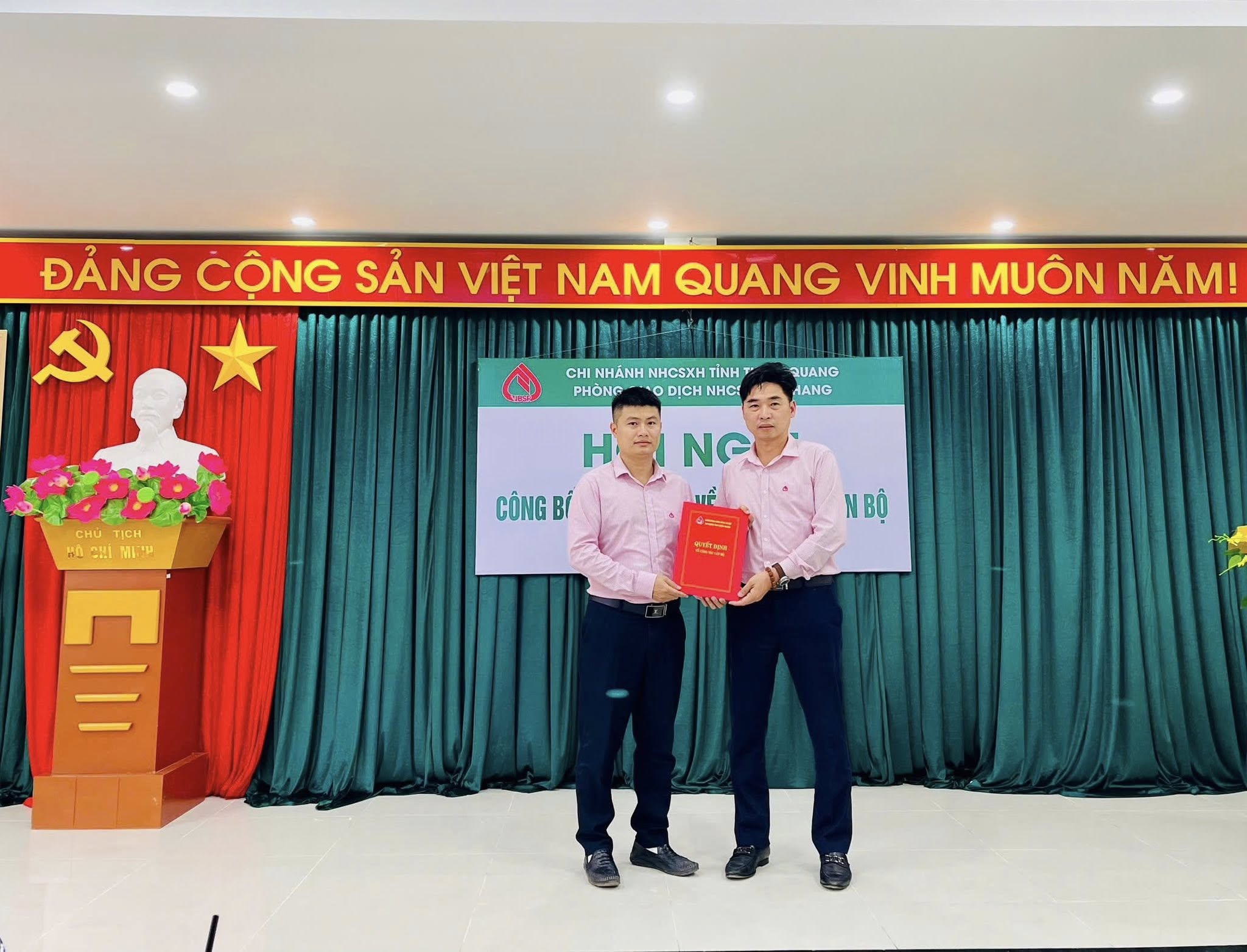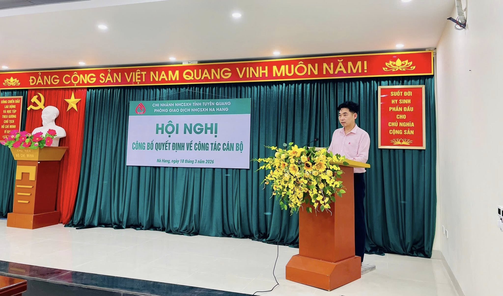 Tại hội nghị, đại diện Chi nhánh Ngân hàng Chính sách xã hội tỉnh đã công bố Quyết định bổ nhiệm đồng chí Nguyễn Đức Dũng giữ chức vụ Phó Giám đốc Phòng giao dịch Ngân hàng Chính sách xã hội Na Hang. Đây là sự kiện có ý nghĩa quan trọng, góp phần kiện toàn bộ máy lãnh đạo của đơn vị, đáp ứng yêu cầu nhiệm vụ trong giai đoạn mới.