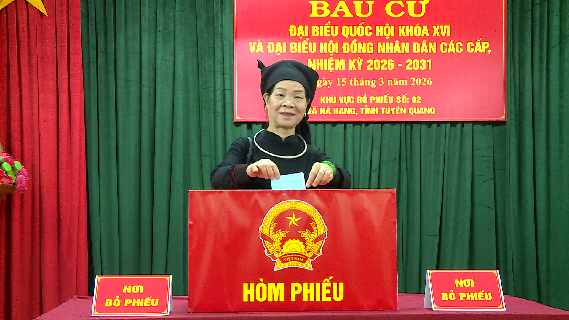 Ngay từ sáng sớm, khắp các thôn, bản trên địa bàn xã Nà Hang đã rộn ràng không khí ngày hội. Tại các khu vực bỏ phiếu, cờ Tổ quốc, băng rôn, khẩu hiệu được treo trang trọng; khu vực niêm yết danh sách cử tri, danh sách và tiểu sử các ứng cử viên được bố trí khoa học, tạo thuận lợi để cử tri theo dõi, tìm hiểu trước khi thực hiện quyền bầu cử. Lực lượng phục vụ bầu cử tại các khu vực bỏ phiếu đã có mặt từ sớm, chuẩn bị chu đáo các điều kiện cần thiết để cuộc bầu cử diễn ra thuận lợi, đúng quy trình và đảm bảo an ninh, trật tự.