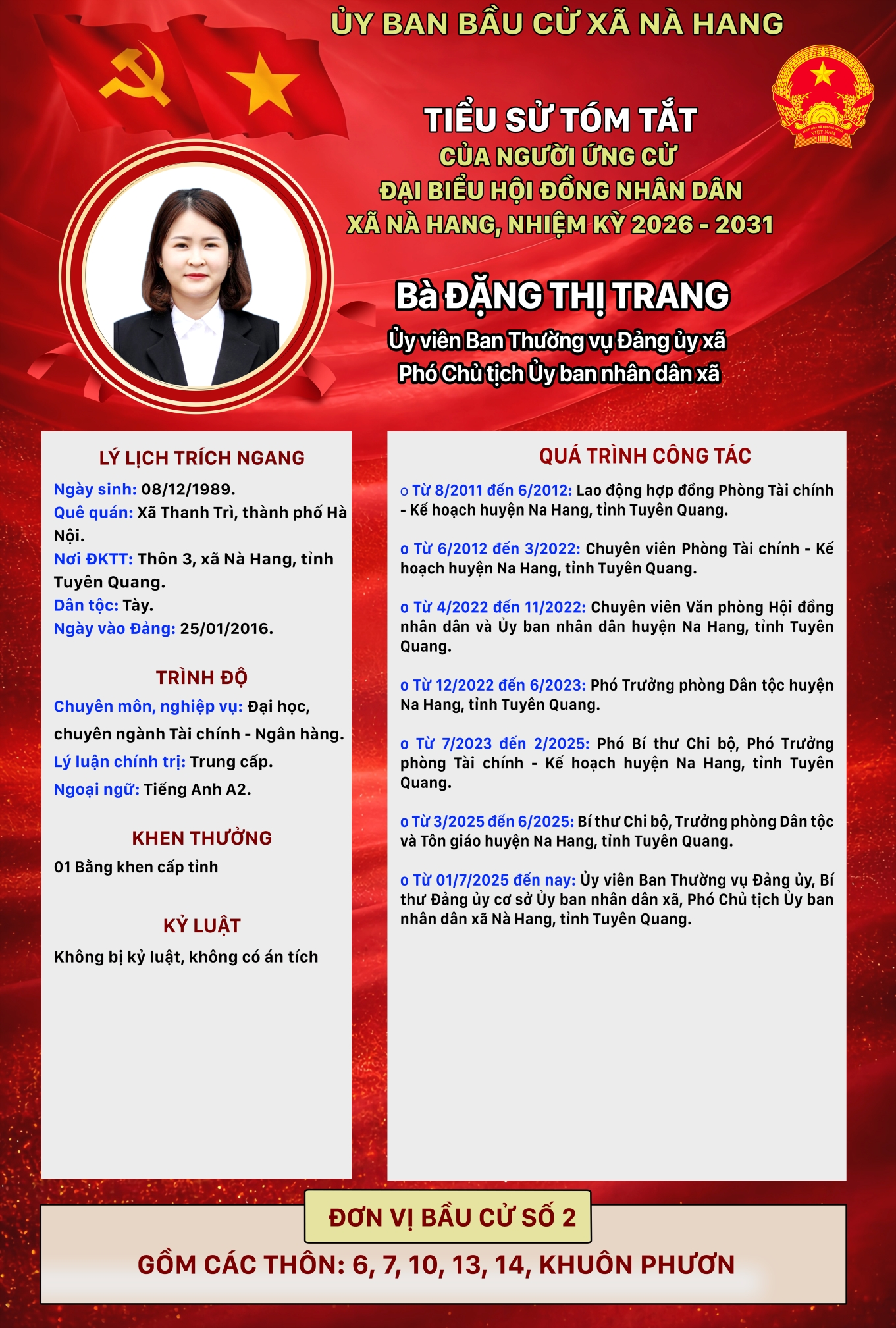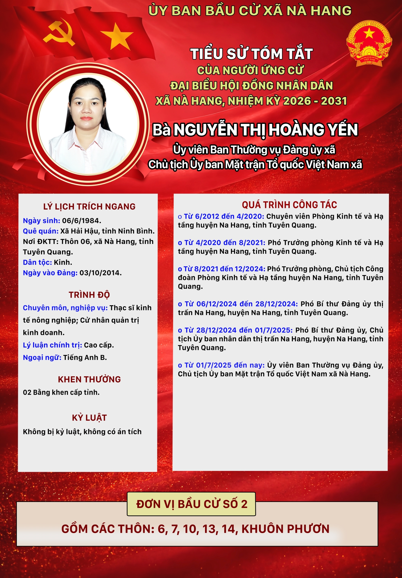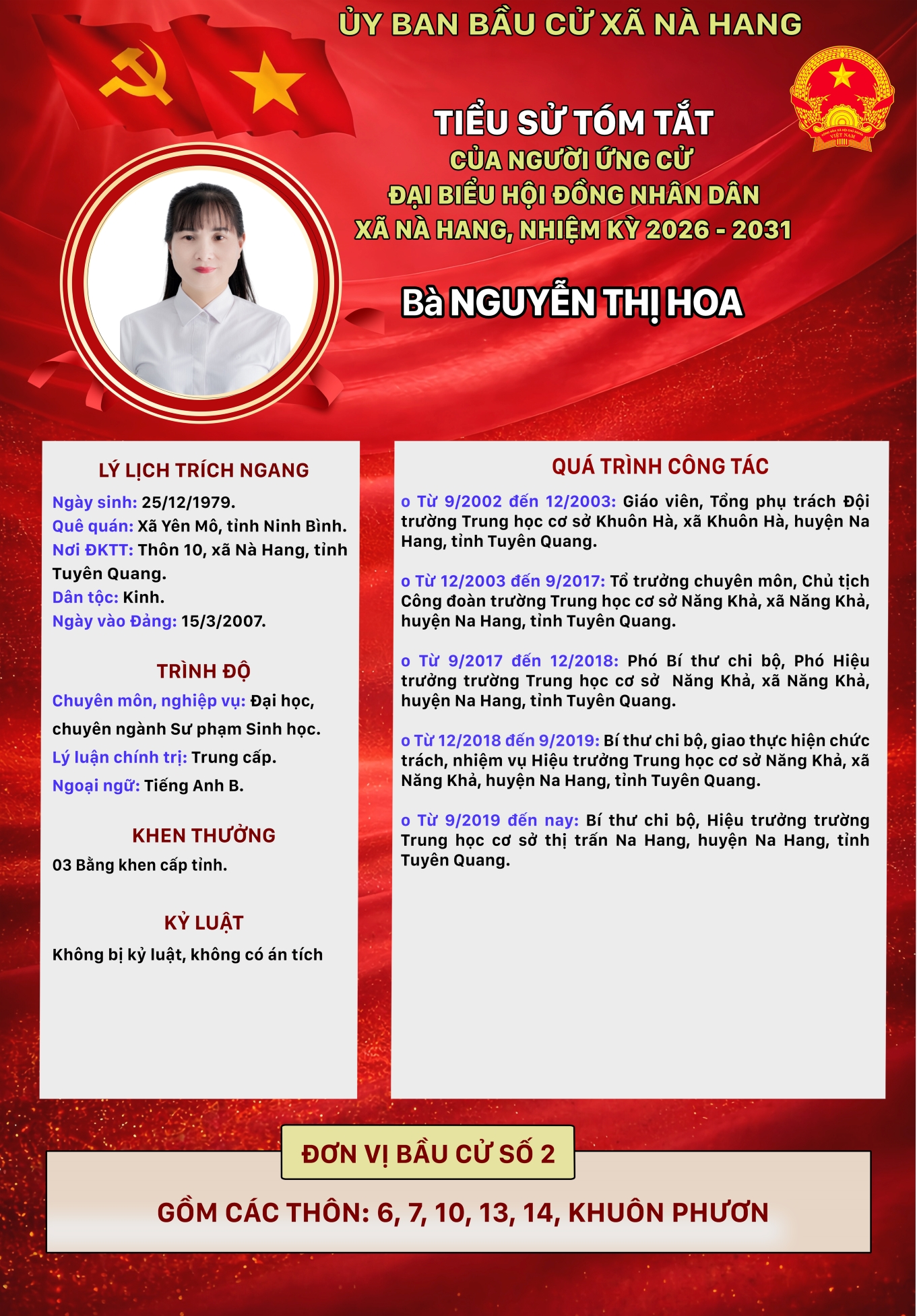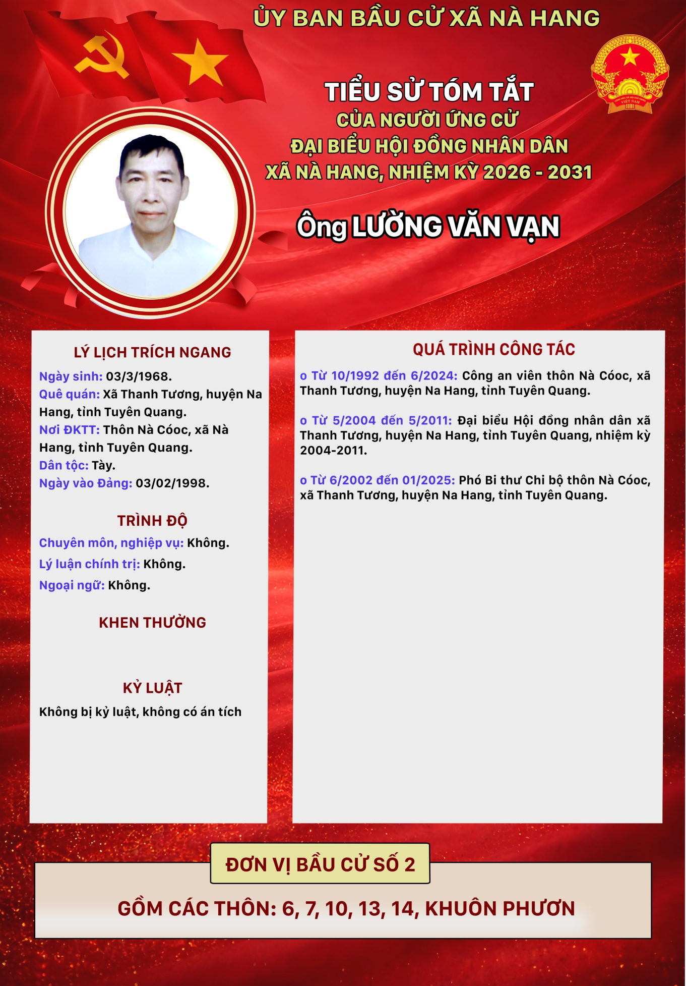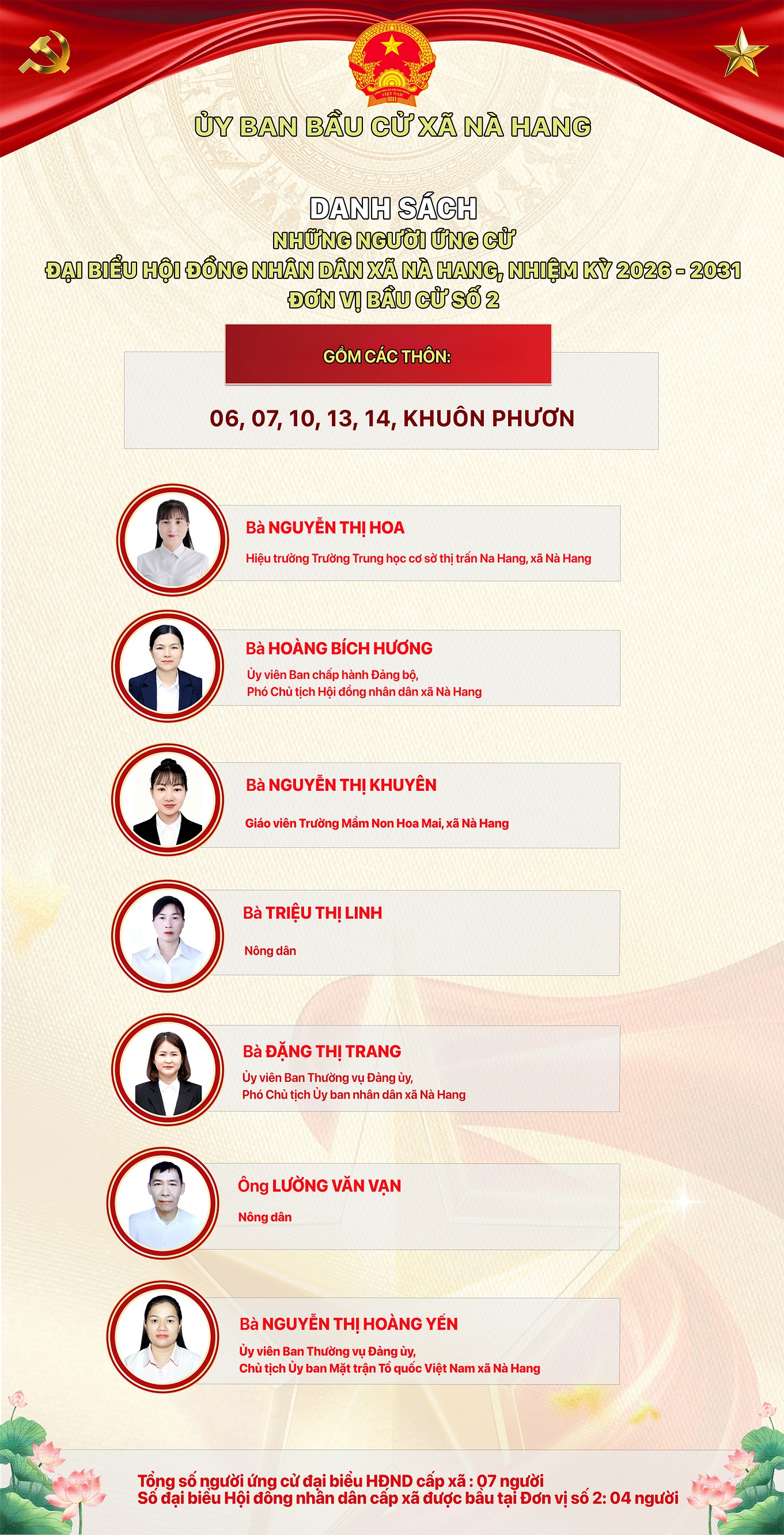 DANH SÁCH CHÍNH THỨC NHỮNG NGƯỜI ỨNG CỬ ĐẠI BIỂU HỘI ĐỒNG NHÂN DÂN XÃ NÀ HANG KHÓA II, NHIỆM KỲ 2026 - 2031 Đơn vị bầu cử số 2, gồm các thôn: 6, 7, 10, 13, 14, Khuôn Phươn