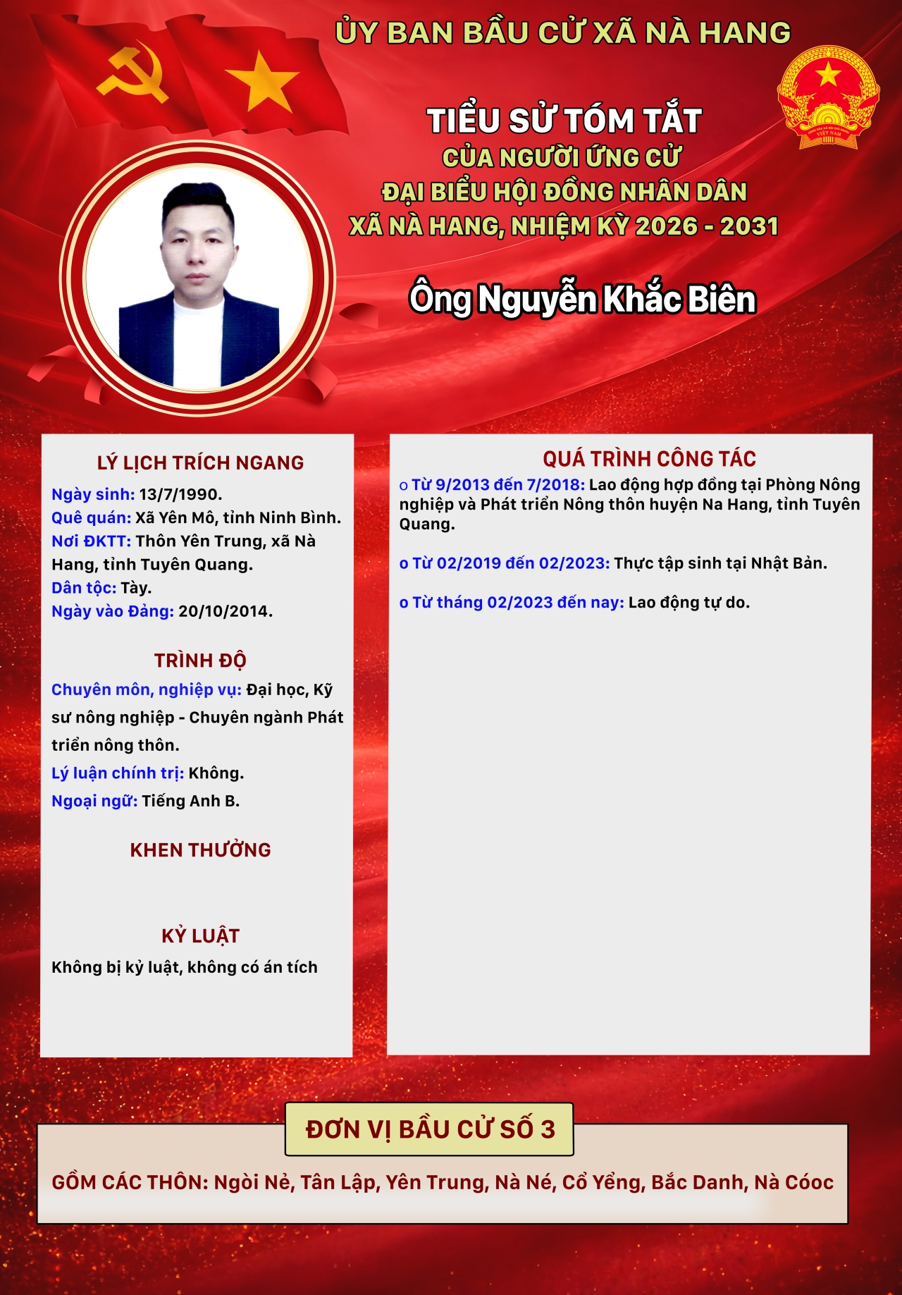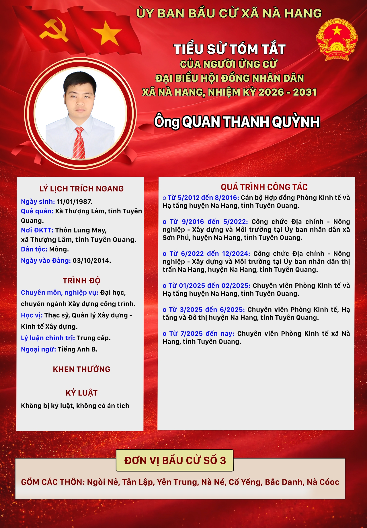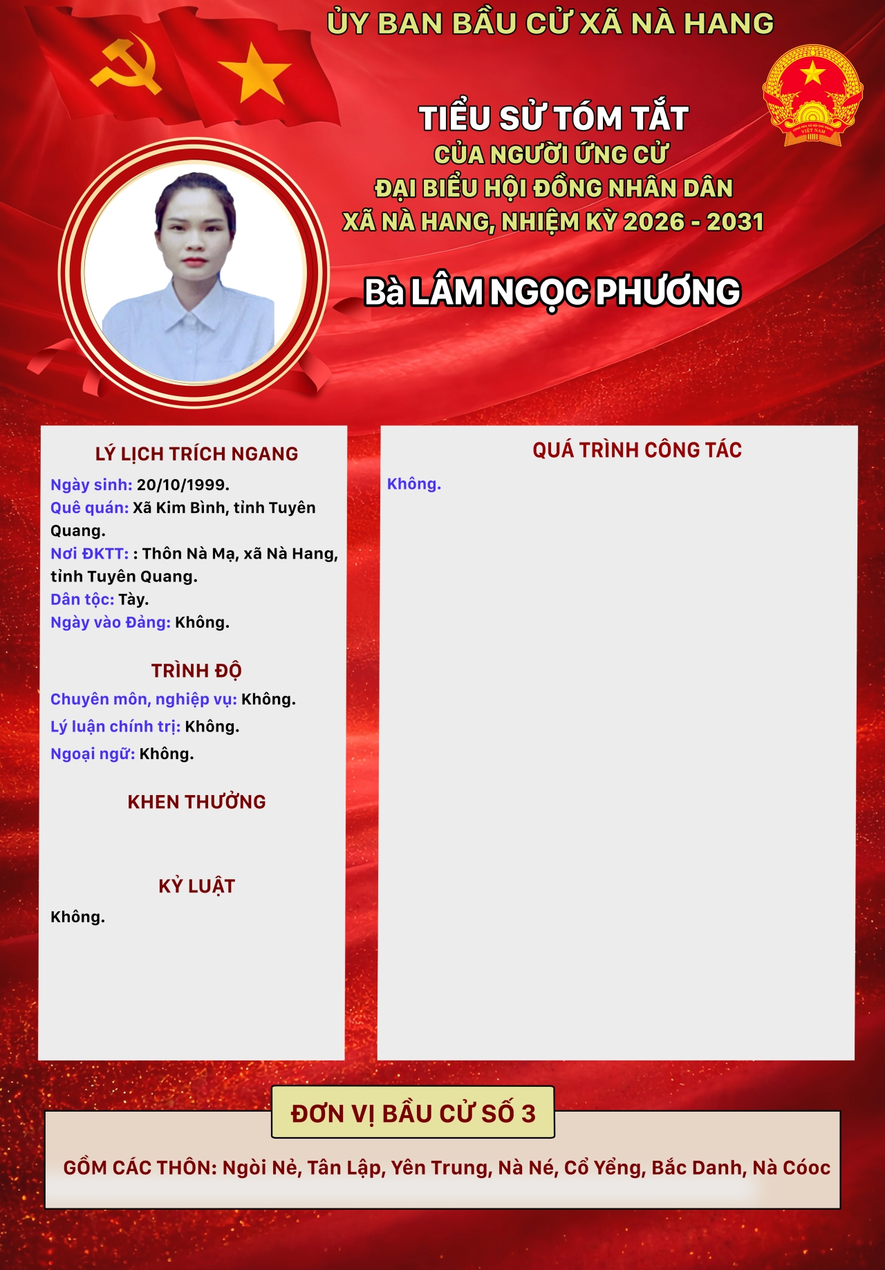 DANH SÁCH CHÍNH THỨC NHỮNG NGƯỜI ỨNG CỬ ĐẠI BIỂU HỘI ĐỒNG NHÂN DÂN XÃ NÀ HANG KHÓA II, NHIỆM KỲ 2026 - 2031 Đơn vị bầu cử số 3, gồm các thôn: Ngòi Nẻ, Tân Lập, Yên Trung, Nà Né, Cổ Yểng, Bắc Danh, Nà Cóoc