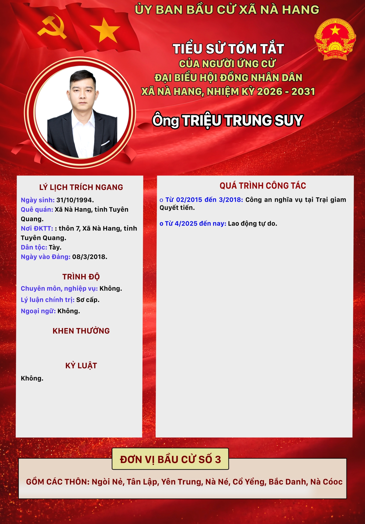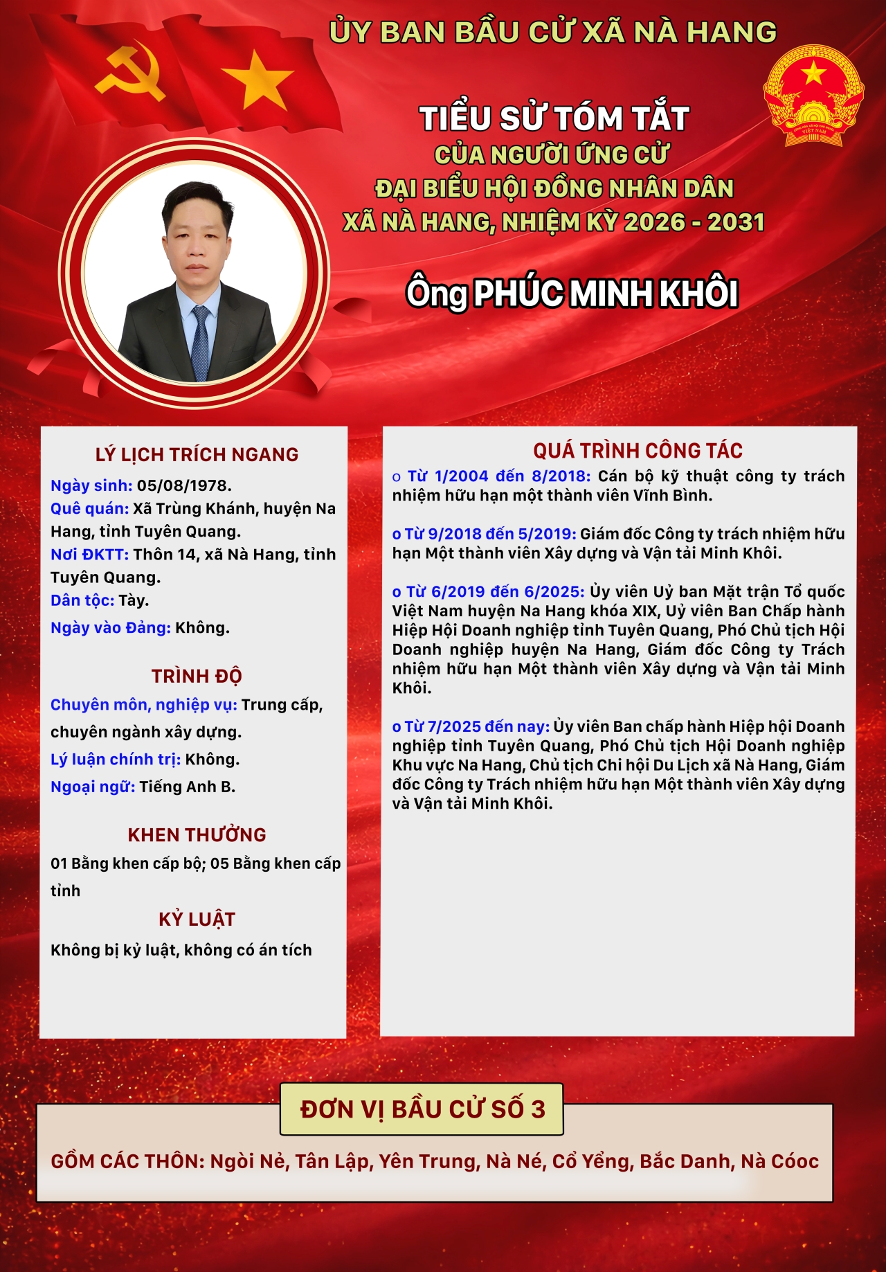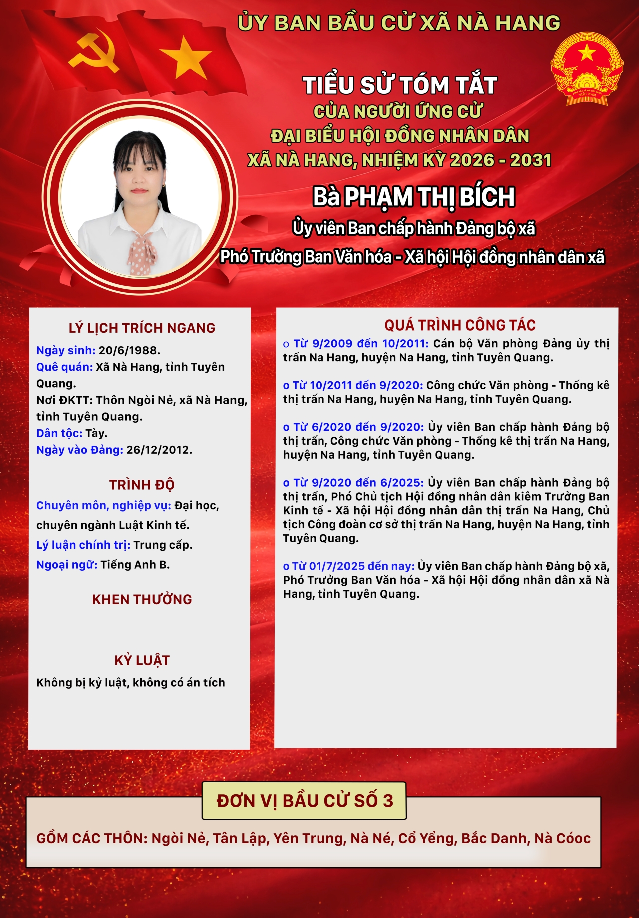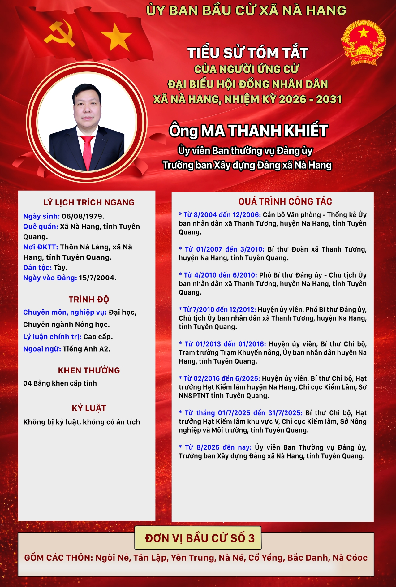 DANH SÁCH CHÍNH THỨC NHỮNG NGƯỜI ỨNG CỬ ĐẠI BIỂU HỘI ĐỒNG NHÂN DÂN XÃ NÀ HANG KHÓA II, NHIỆM KỲ 2026 - 2031 Đơn vị bầu cử số 3, gồm các thôn: Ngòi Nẻ, Tân Lập, Yên Trung, Nà Né, Cổ Yểng, Bắc Danh, Nà Cóoc