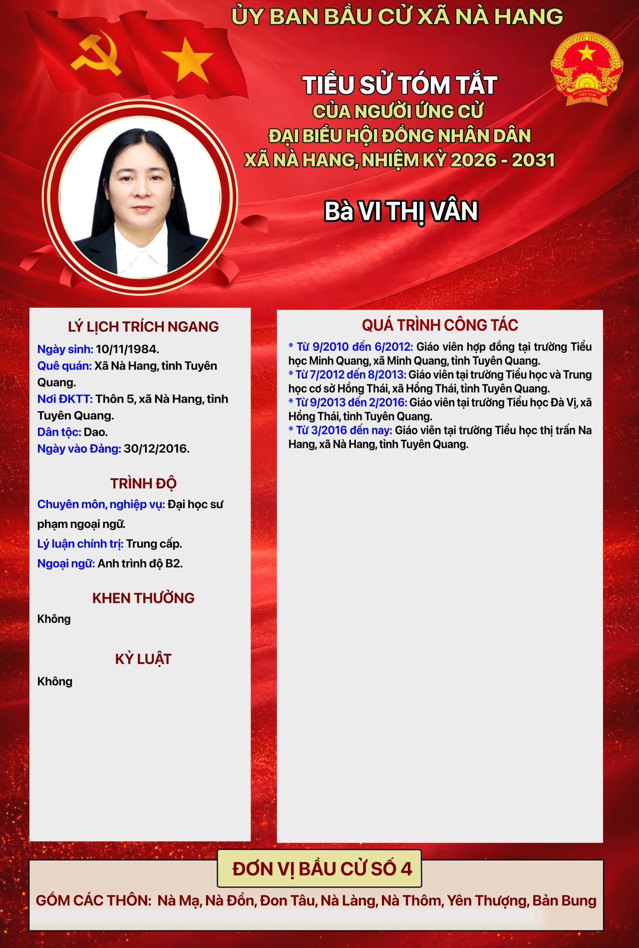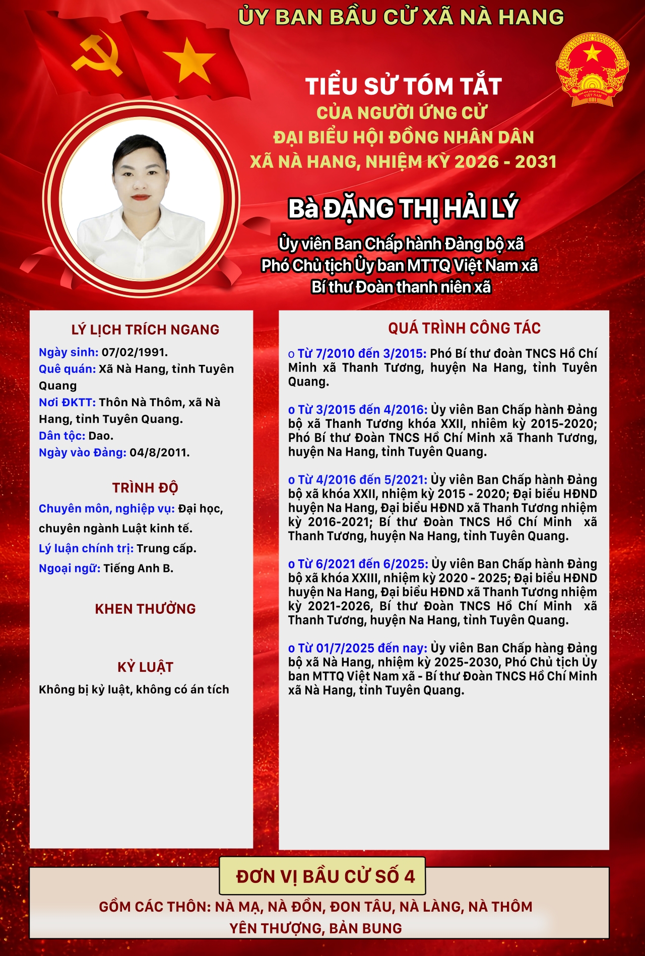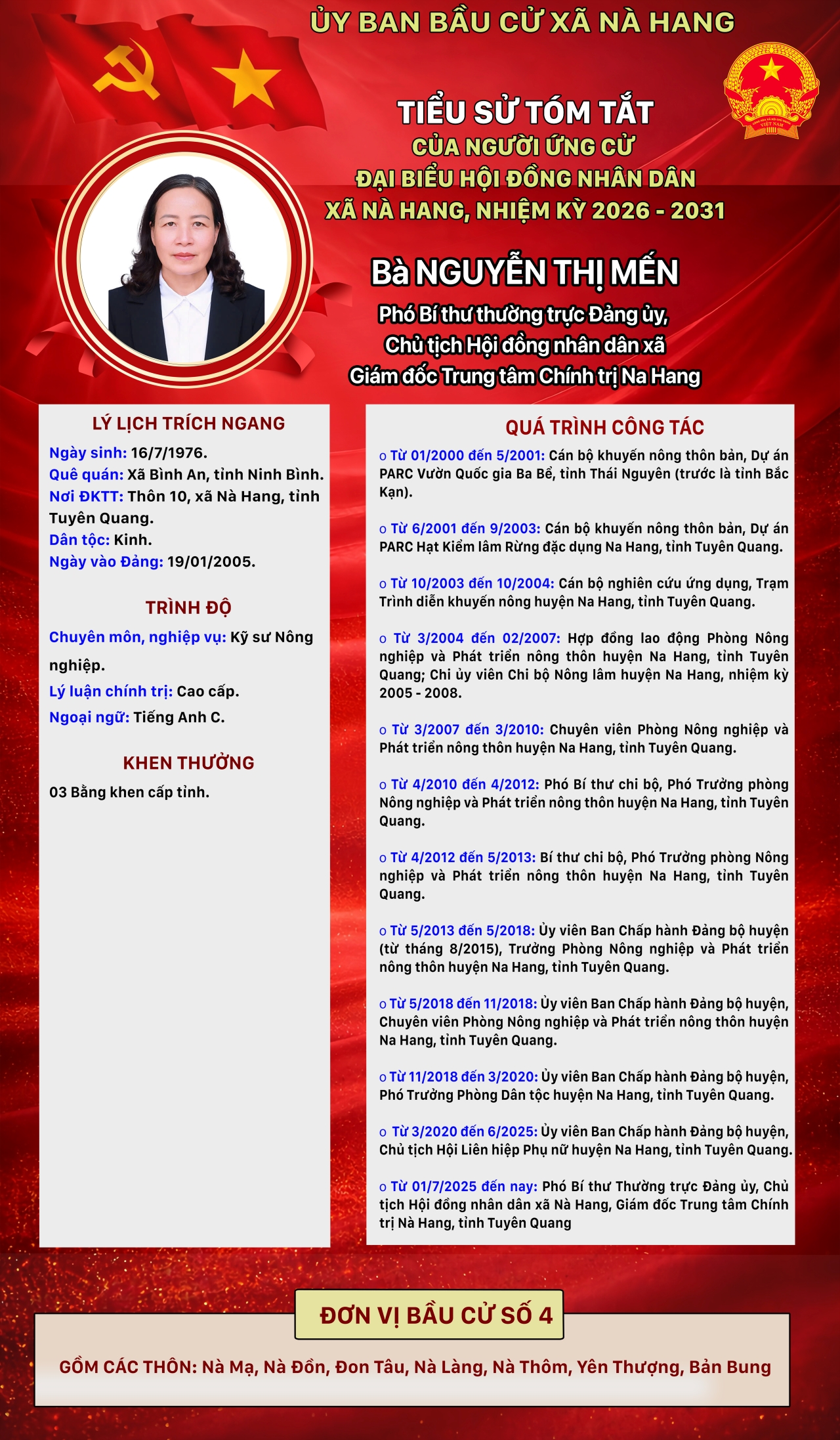 DANH SÁCH CHÍNH THỨC NHỮNG NGƯỜI ỨNG CỬ ĐẠI BIỂU HỘI ĐỒNG NHÂN DÂN XÃ NÀ HANG KHÓA II, NHIỆM KỲ 2026 - 2031 Đơn vị bầu cử số 4, gồm các thôn: Nà Mạ, Nà Đồn, Đon Tâu, Nà Làng, Nà Thôm, Yên Thượng, Bản Bung