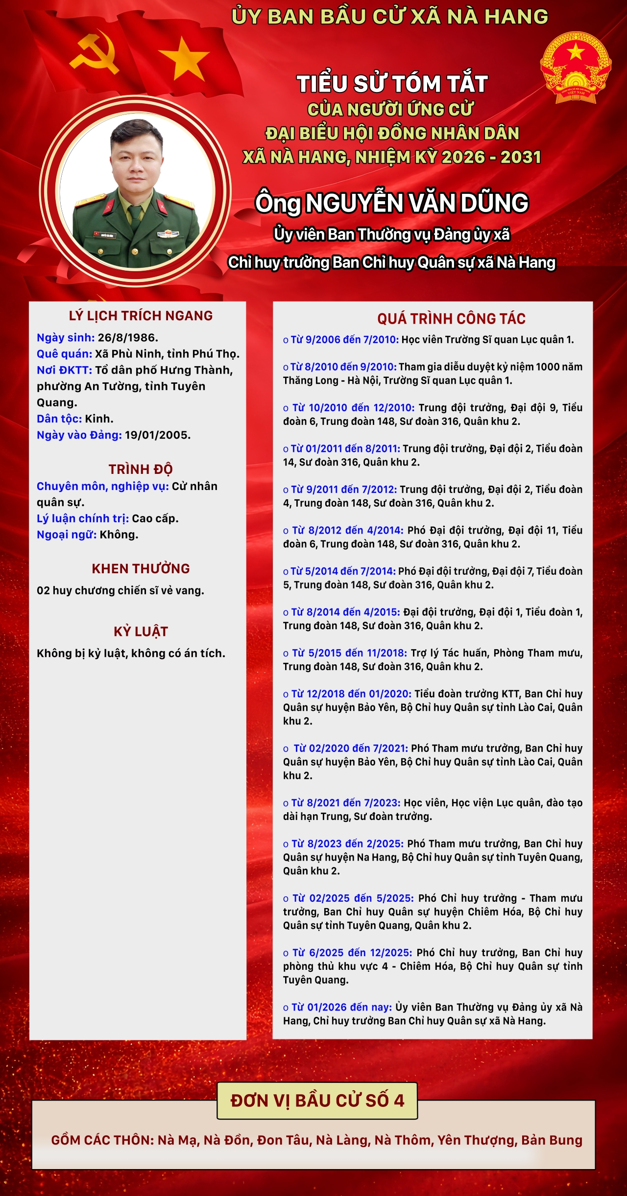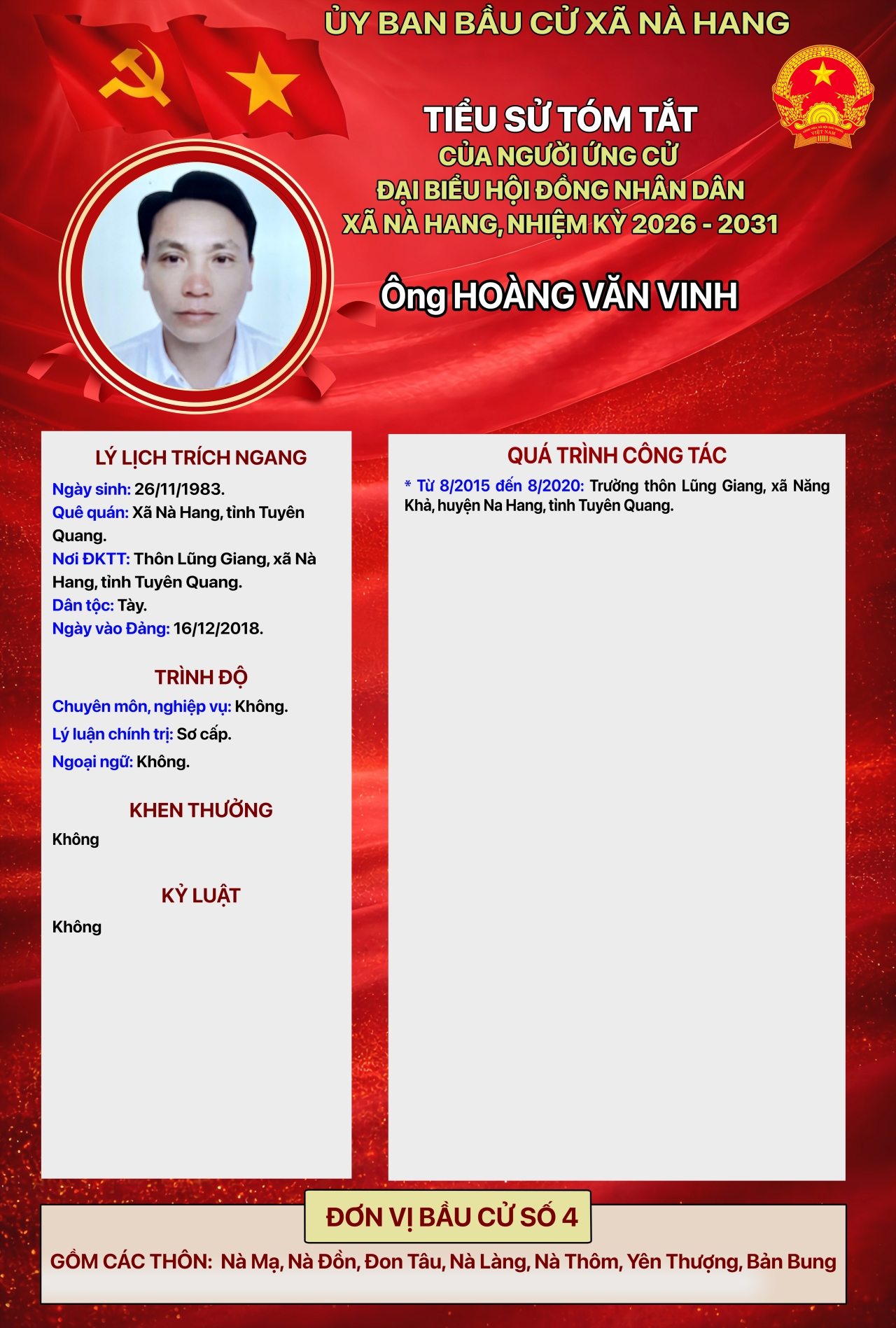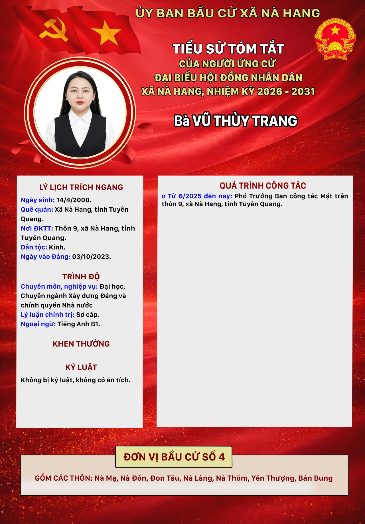 DANH SÁCH CHÍNH THỨC NHỮNG NGƯỜI ỨNG CỬ ĐẠI BIỂU HỘI ĐỒNG NHÂN DÂN XÃ NÀ HANG KHÓA II, NHIỆM KỲ 2026 - 2031 Đơn vị bầu cử số 4, gồm các thôn: Nà Mạ, Nà Đồn, Đon Tâu, Nà Làng, Nà Thôm, Yên Thượng, Bản Bung