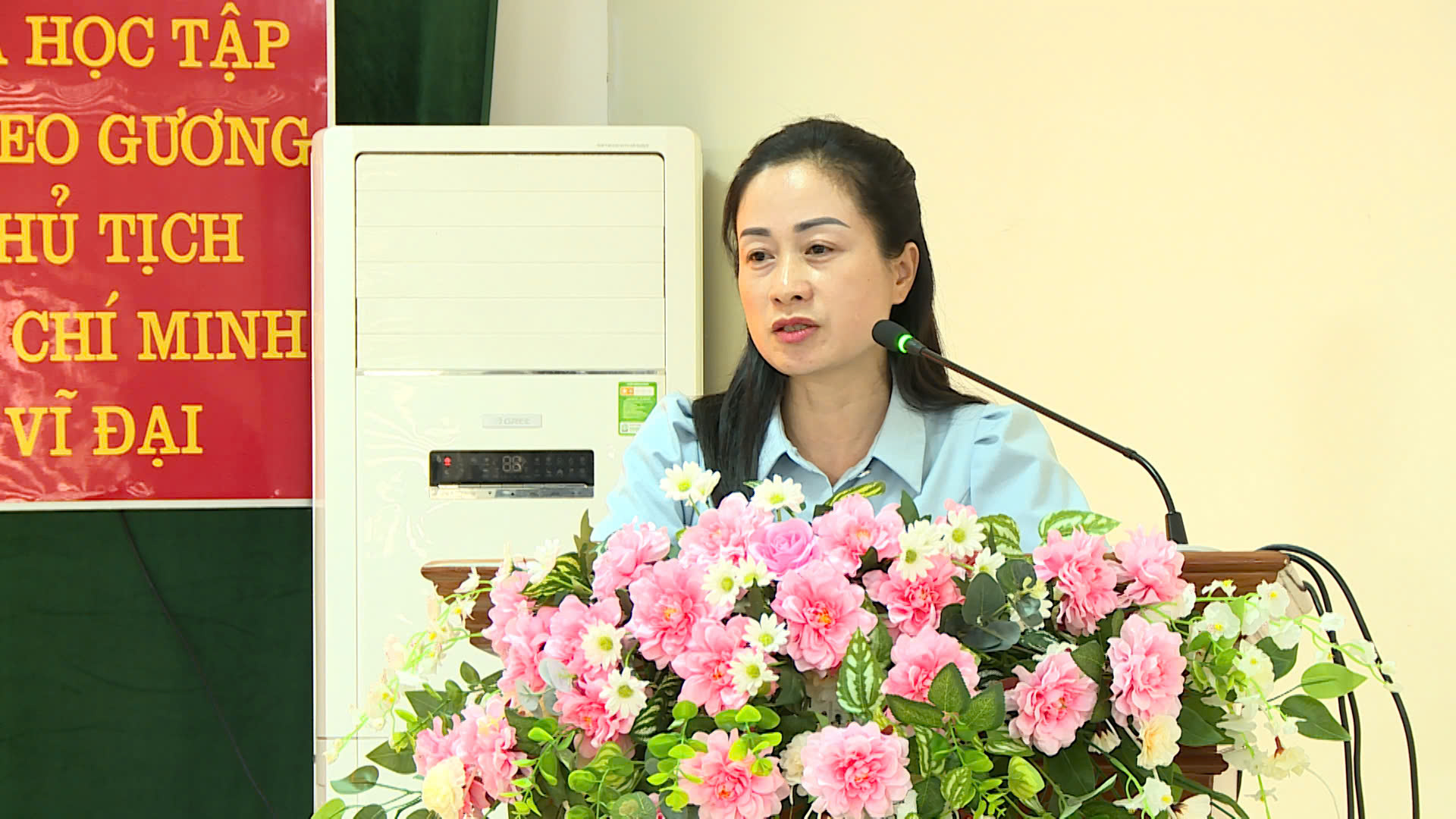 Đồng chí Bùi Thị Xuyên, Phó Bí thư Đảng ủy, Chủ tịch UBND xã phát biểu thông tin khái quát về tình hình địa phương
