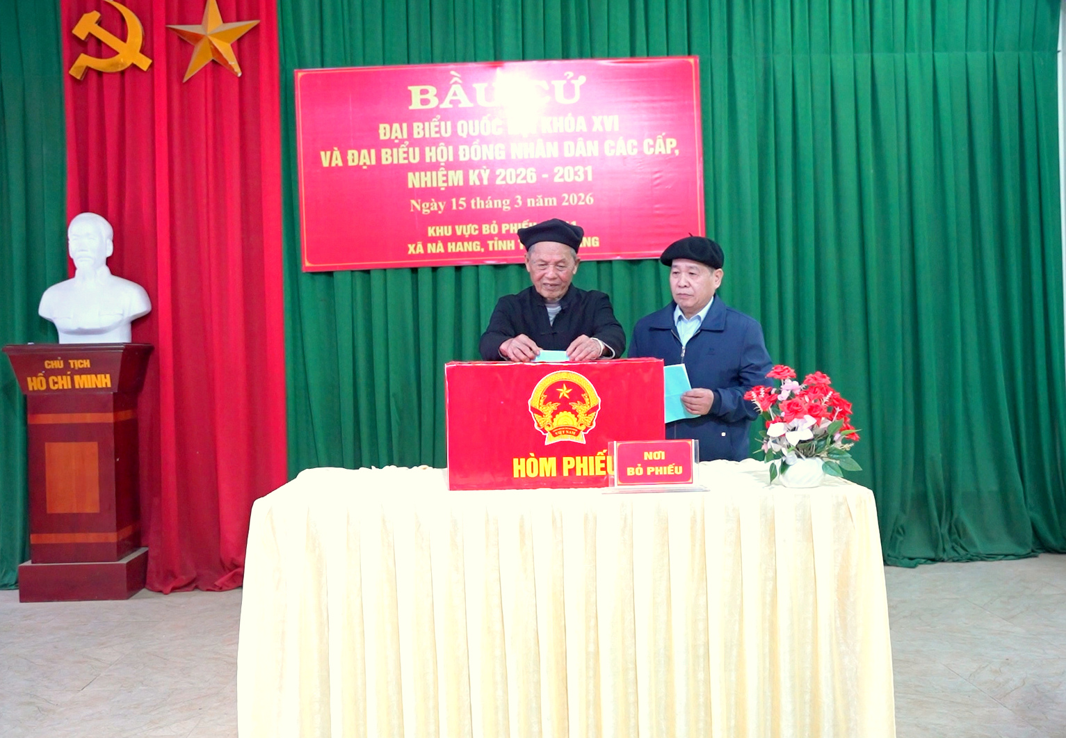 Đồng chí Nguyễn Thị Mến, Phó Bí thư Thường trực Đảng ủy, Chủ tịch HĐND xã, Giám đốc Trung tâm Chính trị Nà Hang thực hiện bỏ phiếu bầu đại biểu Quốc hội khóa XVI và đại biểu HĐND các cấp nhiệm kỳ 2026–2031 tại khu vực bỏ phiếu số 11