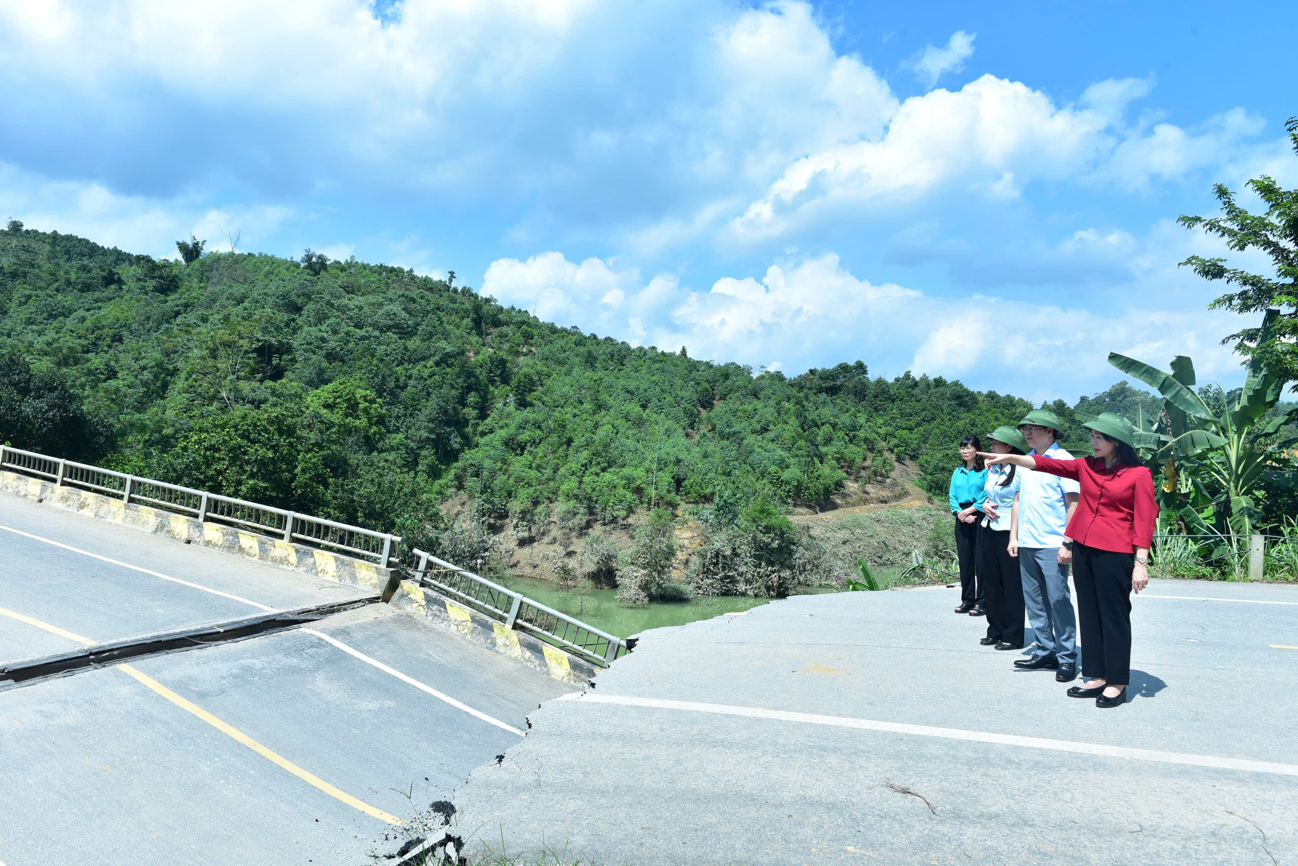 Đồng chí Phó Bí thư Thường trực chuyên trách Đảng ủy UBND tỉnh Nông Thị Bích Huệ nắm tình hình thực địa hiện trường sập cầu Tát Luông trên địa phận xã Nà Hang.