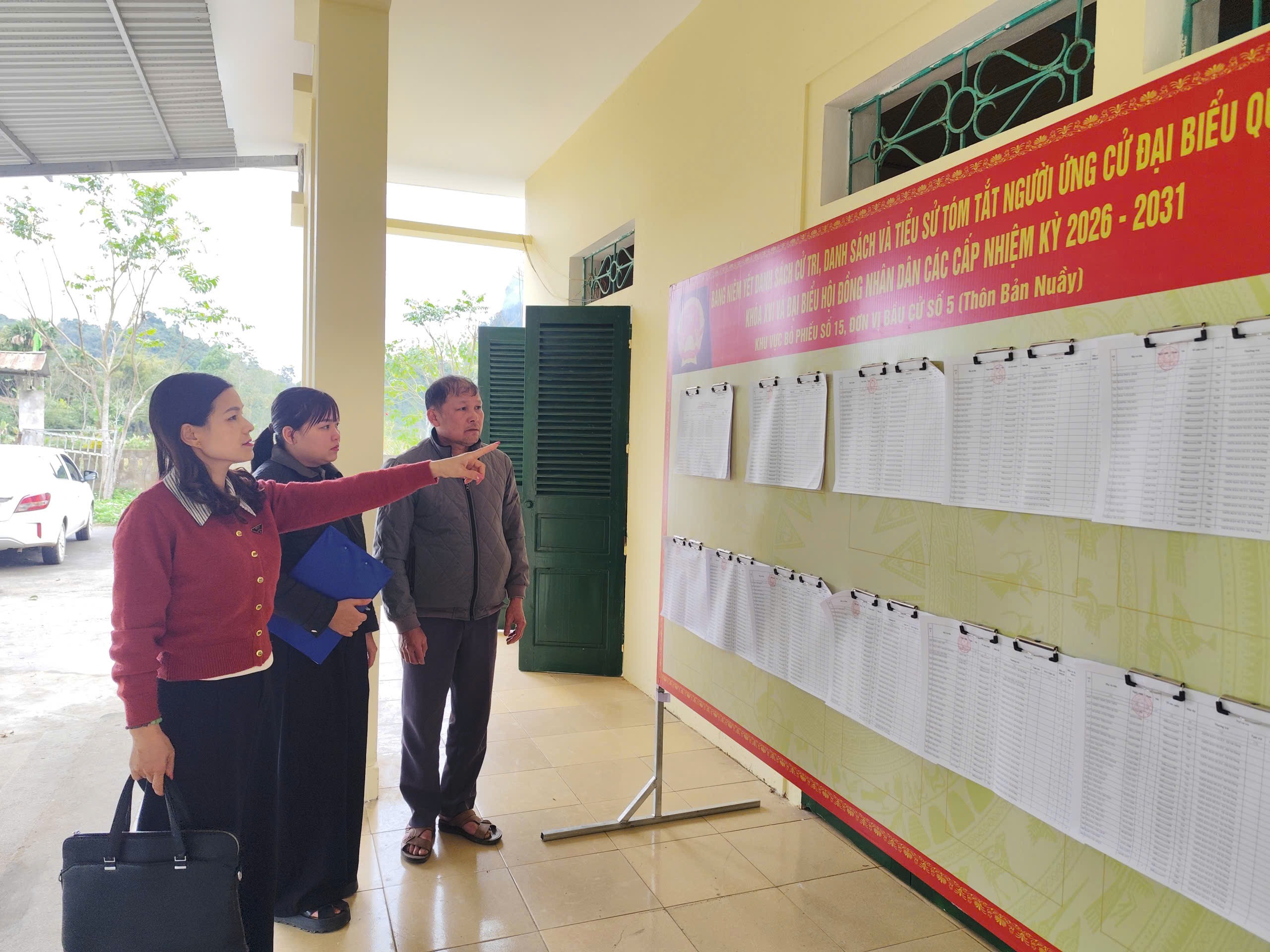 Đoàn công tác kiểm tra việc niêm yết danh sách cử tri và công tác chuẩn bị tại Tổ bầu cử số 15 (thôn Bản Nuầy)
