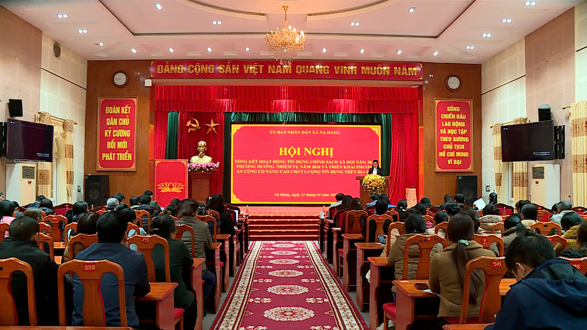 Sáng ngày 21/01, Uỷ ban nhân dân xã Nà Hang tổ chức Hội nghị tổng kết hoạt động tín dụng chính sách xã hội năm 2025; triển khai phương hướng, nhiệm vụ năm 2026. Dự hội nghị có các đồng chí: Đỗ Ngọc Tuấn, Phó Giám đốc Chi nhánh Ngân hàng Chính sách xã hội tỉnh Tuyên Quang; Âu Thế Thái, Tỉnh ủy viên, Bí thư Đảng ủy xã; Bùi Thị Xuyên, Phó Bí thư Đảng ủy, Chủ tịch Uỷ ban nhân dân xã; lãnh đạo Hội đồng nhân dân, Uỷ ban nhân dân, Ủy ban Mặt trận Tổ quốc xã; lãnh đạo Phòng giao dịch Ngân hàng Chính sách xã hội Na Hang; các tổ chức chính trị – xã hội nhận ủy thác và đại diện các thôn trên địa bàn.