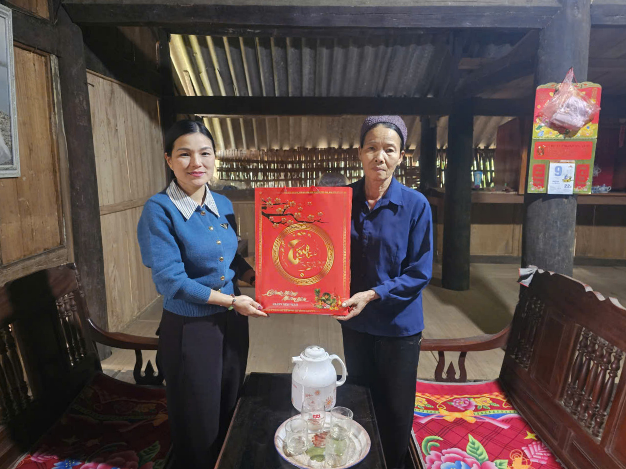 Đồng chí Hoàng Bích Hương, Ủy viên Ban Chấp hành Đảng bộ xã, Phó Chủ tịch HĐND xã tặng quà, chúc tết đồng chí Nông Thị Tấm, Nguyên Bí thư Đảng uỷ xã Năng Khả