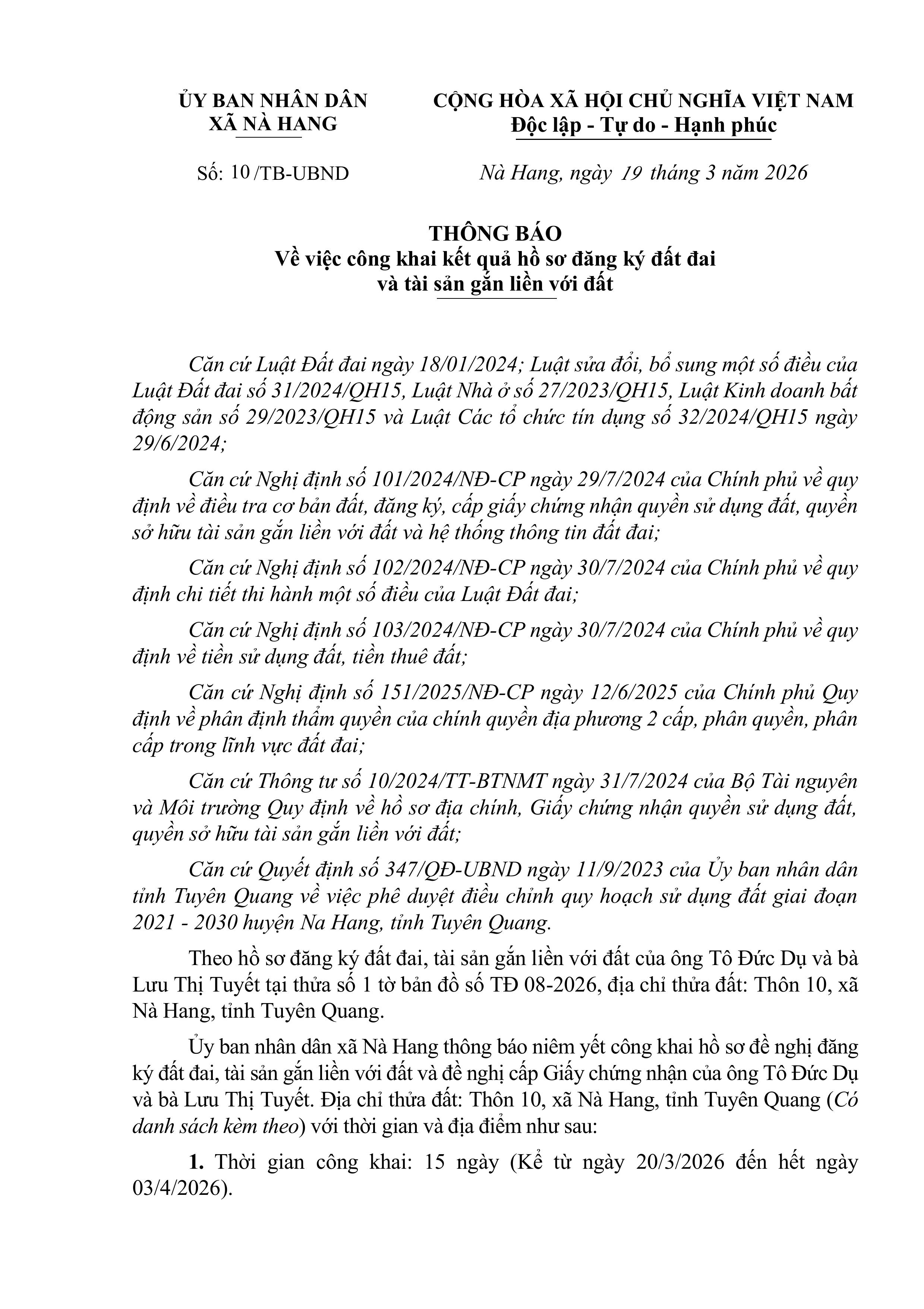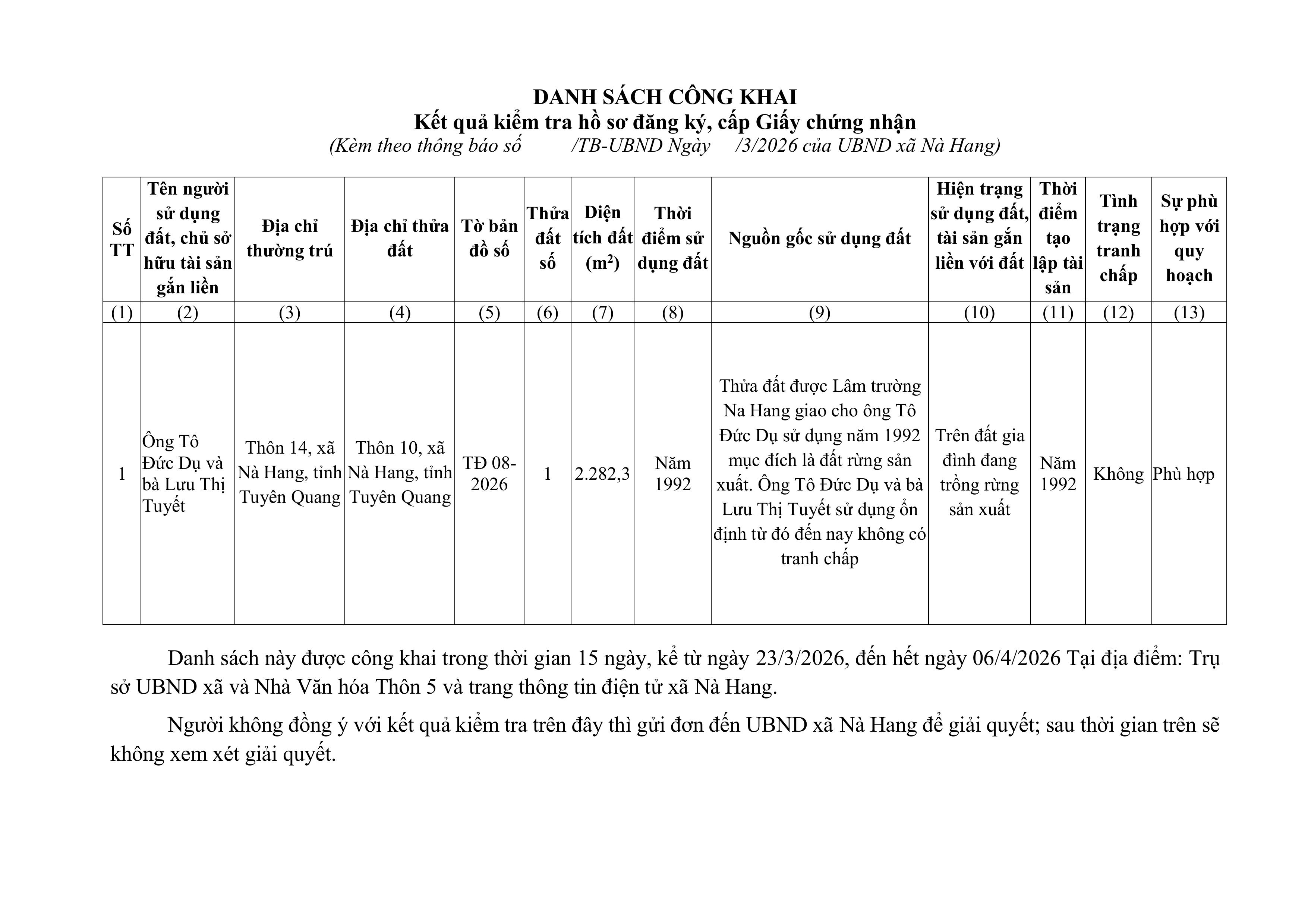 THÔNG BÁO Về việc công khai kết quả hồ sơ đăng ký đất đai và tài sản gắn liền với đất